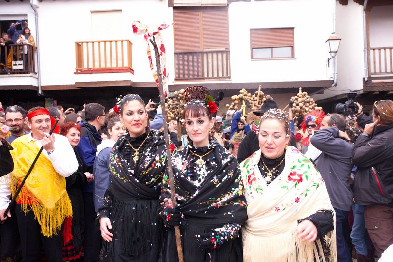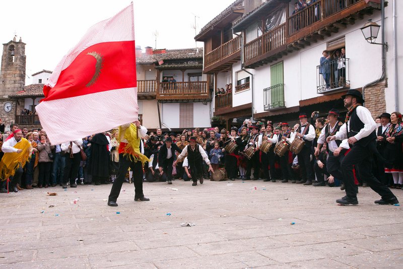 Por la tarde todo es color en la Plaza de Villanueva de la Vera. Los hombres y mujeres de la localidad se engalanan con sus trajes tradicionales. Es el momento en el que los capitanes salen a escena. Él porta la bandera, ella un chorizo atado a una zarza que simboliza la castración del Pero-Palo. En este rito no falta la música con coplas que alaban la belleza de la capitana y el valor del capitán.